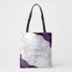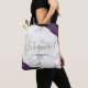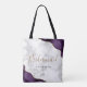 This elegant modern bridesmaid tote bag features a purple watercolor agate design trimmed with gold faux glitter in two corners. The word "Bridesmaid" appears in gold handwriting script on a gray and white marble background. Add her name in black copperplate font.