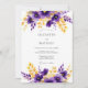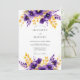 A vibrant palette of royal purple and golden yellow creates a regal and artistic atmosphere for a seasonal ceremony. Hand-painted watercolor blossoms and delicate leafy sprigs adorn the edges, creating a balanced aesthetic. These rich violet pansies and golden ferns offer a sophisticated touch. Set against a clean white backdrop, the saturated pigments provide a striking contrast.