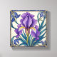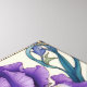 A purple iris flower with yellow accents, surrounded by green leaves and a blue floral border, art nouveau style, intricate details, vibrant colors, elegant design.