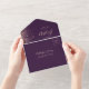 The left-hand edge of this elegant modern all-in-one wedding invitation and RSVP features a rose gold faux glitter border. The customizable text combines rose pink whimsical handwriting, copperplate and italic fonts on a purple background. The return address appears on the outside flap and the reverse side of the detachable RSVP card in rose pink text on solid purple. A QR code is included on the RSVP card for guests who would prefer to reply online.