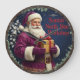 This unique clock features a smiling Santa Claus wearing an unconventional, rich magenta/purple suit with white fur trim, holding a golden wrapped gift tied with a red ribbon. The dark blue background is adorned with stars and eucalyptus-like leaves and bell accents. The text "Santa's North Star Workshop" is written in red script. The design may look real due to the high detail and three-dimensional texture in the artwork.