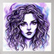 Dieses skurrile Poster zeichnet sich durch einen lebendigen Aufdruck des nahen Gesichts einer jungen Frau aus, der in einem lila, blauen Aquarelldruck fertig gestellt ist.