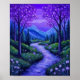 This whimsical poster features a serene purple-hued landscape with a winding river, blossoming trees, and distant mountains evokes tranquility and natural beauty in this vibrant painting. Finished in an oil acrylic paint art print.