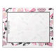 Ein Notizblock mit rosa und schwarz Retro-Katzenauge-Sonnenbrille, rosa Wechselpuren mit grauen Polka-Punkten, rosa Kupplungsbeutel mit schwarzem Bogen, rosa Lippensticks, rosa Edelsteine und eine Flasche Parfüm mit rosa Zerstäuber. Personalisieren Sie mit Ihrem Namen.