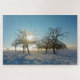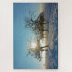 Bäume bei Sonnenaufgang im Winter mit Schnee und Sonne im Nebel des Morgens