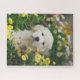 ein hübsches Puzzle mit einem Welpenbild in einem Blumengarten.