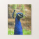 Pfauenportrait. Schöner blauer Hals und Kopf. Weiße Maske um das Auge. Blaue Tüten auf Kronfedern.