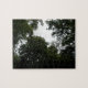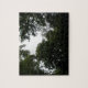 Dieses phantastische Rätsel zeigt ein Foto, das aus einem dichten Wald stammt. Das Foto zeigt die Dunkelheit der Bäume und einen kleinen Bereich des grauen Himmels. Das Ergebnis ist eine unheimliche und stimmungsvolle Szene.