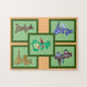Drachenpuppen Set gegen blassgrüne Hintergründe, in dunkelgrünen Rahmen. Fünf verschiedene Dolls (blau, grün, gelb, gestreift, und Bonbons). In jeder Ecke befindet sich ein Bild, das fünfte Bild befindet sich in der Mitte. Rahmen sind Set auf einem Hintergrund.