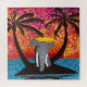 Elefant stehend auf einer kleinen Insel zwischen Palmen. Die Landschaft ist mit malerischen Punkten gestaltet. Blaues Wasser und sonniger Himmel, mit Insel und Bäumen in der Silhouette. Zwischen den beiden Palmen befindet sich ein gekreuzter Spielzeugelefant.