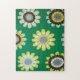 Daisy Muster funktionierte in Häkelchen. Mehrere Blume in Gelbtönen mit grauem, braunem und bräunlichem Hintergrund auf kelgrün.
