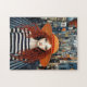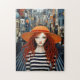 Das spielerische Design erfasst den Kern einer märchenhaften Reise, auf der das rot-haarige Mädchen eine magische Welt voller Fantasie erforscht. Der gestreifte Pfad schafft ein Gefühl von Bewegung und Neugier und führt Sie durch das Rätsellöseerlebnis.Wenn Sie das Rätsel zusammenstellen, zeigt jeder Abschnitt mehr Details der abstrakten kleinen Häuser im Hintergrund, die dem Bild eine Tiefe und ein Rätsel verleihen.