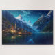 Puzzle mit bezauberndem Dorfsee in den Alpen, Fantasy-Illustration.