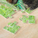 Ein farbenfroher Pfau steht auf einem niedrigen Hügel unter den Bäumen. Er scheint die umliegende Landschaft zu erkunden. Das helle Blau von Hals und Kopf sticht in der Mitte des Puzzles hervor, gegenüber den olivgrünen Blätter der Bäume dahinter.