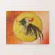 Rumpf vor einer gelben Sonne. Hintergrund "Himmel" von Orangentönen. Cockscomb ist hell rot, Federn sind grün und Orangen. Origianl Keramik Kunst von Nora Chen.