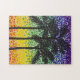 Palmen (3) in der Silhouette, gegen einen regenbogenfarbenen Himmel bei Sonnenuntergang. Himmel wird mit einzelnen farbigen Punkten erzeugt, die von oben lila bis unten rot reichen, mit blauen, grünen, gelben und orangefarbenen Streifen.