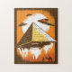 Cooles paranormales Cartoon-Design mit Pyramiden-Heben mit einigen duftigen Untertassen, die herumfliegen und einem Mann mit KamelSilhouette ganz unten