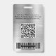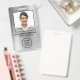 Modernes berufliches Mitarbeiternamenszeichen mit Foto, Name und Position sowie Ihr Firmenlogo vor silberfarbenem Imitat. Fügen Sie auf der Rückseite zusätzliche Informationen und optionale QR- und Bar-Codes hinzu.