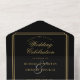 Einladende Einladung zur Hochzeit in Schwarz und Gold mit eleganter Typografie und Monogramm-Initialen. Die Einladung beinhaltet ein perforiertes UAWG mit Ihrem Hochzeitswebsite QR Code und Details. Entwickelt von Thisisnotme©