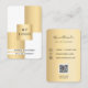 Auf der Vorderseite: Weiß und Imitat goldene Blöcke. Personalisieren Sie Ihr Firmenlogo, Ihren Namen, Ihren Titel und fügen Sie es hinzu. Zurück: ein Imitat goldener Hintergrund. Fügen Sie Ihre Kontaktdaten und Ihren eigenen QR-Code zu Ihrer Website oder Ihrem Social-Media-Account hinzu.