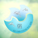 Eine abstrakte Form, die eine Welle darstellt. In der Welle sind silberne springende Delphine und ein Aloha-Text. Mit einem scannbaren qr-Code.