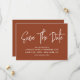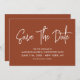 Moderne Kalligraphie Save the Date in Terrakotta erdig mit einem digitalen QR-Code für eine Website oder Kontaktinformationen auf der Rückseite.