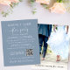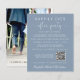Günstige staubblaue Räumlichkeiten oder private Hochzeitsankündigung und Hochzeitsempfang oder Feier Party Einladung. Die Vorderseite bietet "Happily Ever After Party" in schlichter weißer Typografie und ein elegantes weißes Skript mit Swashes. Sie können Ihre Ankündigung und Einladung anpassen, einen QR-Code erstellen, der mit Ihrer Hochzeitswebsite verbunden ist, damit Ihre Gäste mehr Informationen und UAWG online suchen können und Ihre Namen in einem signaturähnlichen Skript hinzufügen können. Auf der Rückseite finden Sie Ihr Lieblings-Foto, Ihre Vornamen und Ihr Hochzeitstermin.