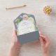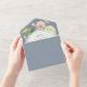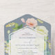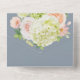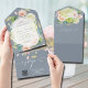 Elegante Aquarellfarben, weiße und grüne Hydrangeas, rosa und cremefarbene Rose, Gänseblümchen auf staubblauem Hintergrund, diese dreiseitigen Hochzeitseinladungen zeigen Ihre Details in schicken Schriften in Sektionen und einen QR-Code für Ihre Hochzeitswebsite, um zu antworten. Mehr Stile, Farben und passende Artikel in unserem Shop.