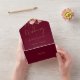 Einmalige Hochzeitseinladung mit eleganter Goldtypografie auf bordeauxrotem Hintergrund. Die Einladung enthält eine perforierte RSVP-Karte mit Ihrem Hochzeitswebseiten QR Code und Details. Entwickelt von Thisisnotme©