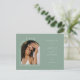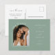 Diese Save the Date Verlobung Ankündigung Einladung Postcard verfügt über einen eleganten Kalligraphie-und Typografie-Schriftart mit einer Bogenform und Foto auf einem schlinggrünen Hintergrund und QR-Code. Die Einfachheit dieses Designs fügt eine Touch von Eleganz zu Ihrer Hochzeit speichern Sie die Datum Einladungskarten. Es funktioniert mit vielen Hochzeitsthemen und ist definitiv eine großartige Ergänzung zu Ihrer Hochzeit. Einfach Namen und Formulierungen in ein paar einfachen Schritten anpassen und die Postkarte mit Ihrem Foto des glücklichen Paares personalisieren und den QR Code durch Ihren auf der Rückseite ersetzen, um Ihrer Postkarte eine angenehme persönliche Touch zu geben. Bitte beachten Sie: Der Bogen-Formsatz "Save the Date" und das elegante Kalligrafieschreiben "und" und der Wortlaut "Formal Invitation to follow" auf der Vorderseite UND das "Save the Date" auf der Rückseite zusammen mit den Zeilen auf der Vorderseite und auf der Rückseite und anderen grafischen Kunstelementen können nicht bearbeitet, verschoben oder gelöscht werden. Sie sind behoben.