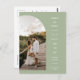 Diese Save the Date Verlobung-Ankündigung Einladung Postcard bietet einen eleganten Kalligraphie-und Sans-Serif-Typografie-Schriftart mit einem bogenförmigen Foto und QR-Code auf einem staubigen grünen Hintergrund für ein sauberes, minimalistisches und modernes Aussehen, was eine schöne Art ist, über Ihre kommende Hochzeit zu informieren. Die Einfachheit dieses Designs fügt eine Touch von Eleganz zu Ihrer Hochzeit speichern Sie die Datum Einladungskarten. Es funktioniert mit vielen Hochzeitsthemen und ist definitiv eine großartige Ergänzung zu Ihrer Hochzeit. Einfach Namen und Formulierungen in ein paar einfachen Schritten anpassen und die Postkarte mit Ihrem Foto des glücklichen Paares personalisieren und den QR Code durch Ihren auf der Rückseite ersetzen, um Ihrer Postkarte eine angenehme persönliche Touch zu geben. Bitte beachten Sie: Die elegante Kalligraphie des Wortschatzes "Save the Date" und "formelle Aufforderung zur Befolgung" sowie der Zeilen und anderen grafischen Grafiken und Elementen können nicht bearbeitet, gelöscht oder verschoben werden. Sie sind repariert.