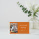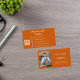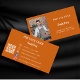 Ein verbrannter, orangefarbener Hintergrund. Personalisieren Sie Foto, Titel, Firmenname/Name und Text und geben Sie diese ein. Kontaktinformationen auf der Vorderseite. Weißer Text. Zurück: Vorlagen für Ihren Namen, Titel, Telefonnummer, E-Mail- und Website-Adresse, Ihren eigenen QR-Code für Ihre Website oder Ihr Social-Media-Konto. Facebook und Instagram Icons/account.
