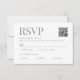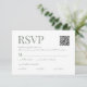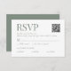 Elegante Weise grün Hochzeit RSVP Karte mit einem scannbaren QR-Code für die Website und 3 bearbeitbaren Mahlzeiten Auswahl. Das Beispiel beinhaltet Fleisch-, Fisch- und vegane Menüs, die aber in jeden anderen Text geändert werden können. Personalisieren Sie es mit Ihrem eigenen Text.