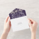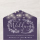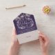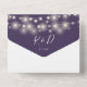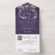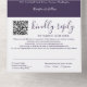 Alles in einer Hochzeitseinladung mit hübschen Saitenlichtern, handgezeichnet Blumengarten und schicker Typografie auf lila Hintergrund. Die Einladung enthält eine perforierte RSVP-Karte mit Ihrem Hochzeitswebseiten QR Code und Details. Entwickelt von Thisisnotme©