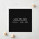 Save the Date Minimalistisch mit einem dramatischen Flair. Flachquadrat mit schwarzem Hintergrund und weißem Text. Einfach elegant mit Raum für individuellen QR Code auf der Rückseite.