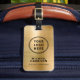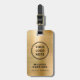 Moderne berufliche Gepäckmarke mit Firmenlogo und QR-Code auf einem vergoldeten Imitat auf metallischem Hintergrund. Fügen Sie Ihren Namen und Titel in einfacher Typografie hinzu.