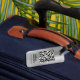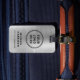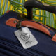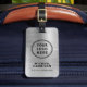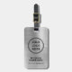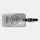 Moderne berufliche Gepäckmarke mit Firmenlogo und QR-Code vor silberfarbenem Imitat. Fügen Sie einen Namen und Titel in einfacher Typografie hinzu.