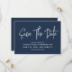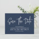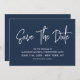 Moderne Kalligraphie Save the Date in marineblau mit einem digitalen QR-Code für eine Website oder Kontaktinformationen auf der Rückseite.