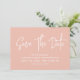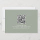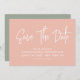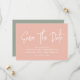 Moderne Kalligraphie Save the Date in pfirsichgrün und Salbei grün mit digitalem QR-Code für eine Website oder Kontaktinformationen auf der Rückseite.