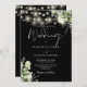 Diese elegante Schwarz-Weiß-Hochzeitseinladung mit hübschen Saitenlichtern und Blumengrün kann mit Ihren Informationen in schicker Typografie personalisiert werden, mit Ihren Angaben zur Hochzeitswebsite und Ihrem QR-Code auf der Rückseite. Entwickelt von Thisisnotme©