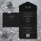 Diese schicke, minimalistische All-in-One-Einladung zur Schwarzweiß-Hochzeit kann mit Ihren Monogramm-Initialen und Hochzeitstag-Informationen personalisiert werden. Die Einladung beinhaltet ein perforiertes UAWG mit Ihrem Hochzeitswebsite QR Code und Details. Entwickelt von Thisisnotme©