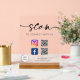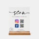 Modernes Skript "Scan zu verbinden mit uns" Acrylzeichen. Passen Sie dieses Schild mit Ihrem QR-Code, Ihrem Firmenlogo und sozialen Medien-Infos an.