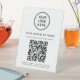 Modernes Tischschild für Ihr Unternehmen mit Ihrem QR-Code für Kunden, um eine Zahlung zu machen, für eine Liste Ihrer Produkte, Dienstleistungen und Preise, für Termine, Anmeldungen, etc. Laden Sie Ihr Logo und Ihren QR-Code hoch und fügen Sie Ihren Firmennamen, Telefonnummer, Straßenadresse oder andere Informationen in einfacher Typografie hinzu. Erschließung des Potenzials für eine höhere Verlobung der Kunden und nahtlose Überbrückung der Kluft zwischen Offline- und Online-Erfahrungen, sodass Ihr Unternehmen im digitalen Zeitalter erfolgreich sein kann.