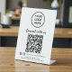 Modernes "Verbinden Sie mit uns" Tischschild für Ihr Unternehmen mit Ihrem QR-Code für Kunden zu scannen, um eine Zahlung zu machen, für eine Liste Ihrer Produkte, Dienstleistungen und Preise, für Termine, zu registrieren, etc. Laden Sie Ihr Logo und Ihren QR-Code hoch und fügen Sie Ihren Firmennamen, Telefonnummer, Straßenadresse oder andere Informationen in einfacher Typografie hinzu. Fügen Sie Ihre instagram und facebook Benutzer-ID für Kunden, um Ihnen auf Social Media folgen.