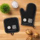 Modernes personalisiertes, schwarz-minimalistisches Oven Mitt & Pot Holder Set mit Firmenlogo, individuellem Text und QR Code. Personalisieren Sie Ihre eigenen Designs.