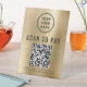 Modernes Tischschild für Ihr Unternehmen mit QR-Code für Kunden, die nach Bezahlung suchen. Fügen Sie Ihr Logo, QR-Code, Telefonnummer und Straßenadresse in einfacher Typografie vor einem vergoldeten Imitat aus Metall.