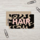 Ein kühner Schriftart in Rosa, auf einem asymmetrischen abstrakten Design in Schwarz. Diese Version hat einen qr-Code auf der Rückseite und richtet sich an Haarstylisten.
