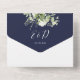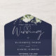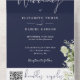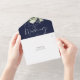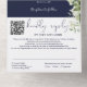 Das Ganze in einer marineblauen Hochzeitseinladung mit botanischer Vegetation, rustikalen Blätter und eleganter Typografie. Die Einladung enthält eine perforierte RSVP-Karte mit Ihrem Hochzeitswebseiten QR Code und Details. Entwickelt von Thisisnotme©