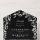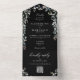 Alle in einer Hochzeitseinladung mit einer schönen Blumenkaskade, eleganter Typografie und Monogramm-Initialen auf schwarzem Hintergrund. Die Einladung enthält eine perforierte RSVP-Karte mit Ihrem Hochzeitswebseiten QR Code und Details. Entwickelt von Thisisnotme©