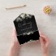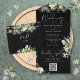 Alles in einer Hochzeitseinladung mit hübschen Saitenlichtern, botanischem Blumengrün und eleganter Typografie auf schwarzem Hintergrund. Die Einladung enthält eine perforierte RSVP-Karte mit QR-Code. Entwickelt von Thisisnotme©